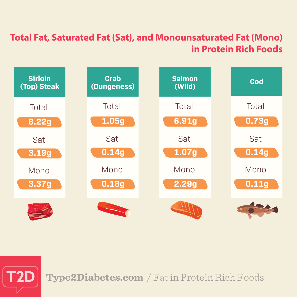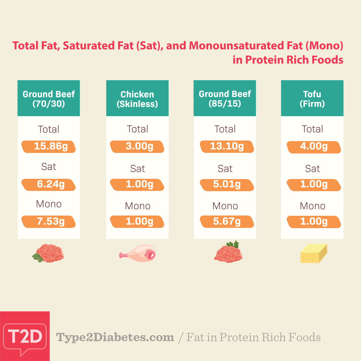 Okay, we’ll do it for you! Below are the approximate amounts of total, saturated, and monounsaturated fat found in a 3 oz portion of the listed protein-rich foods.
